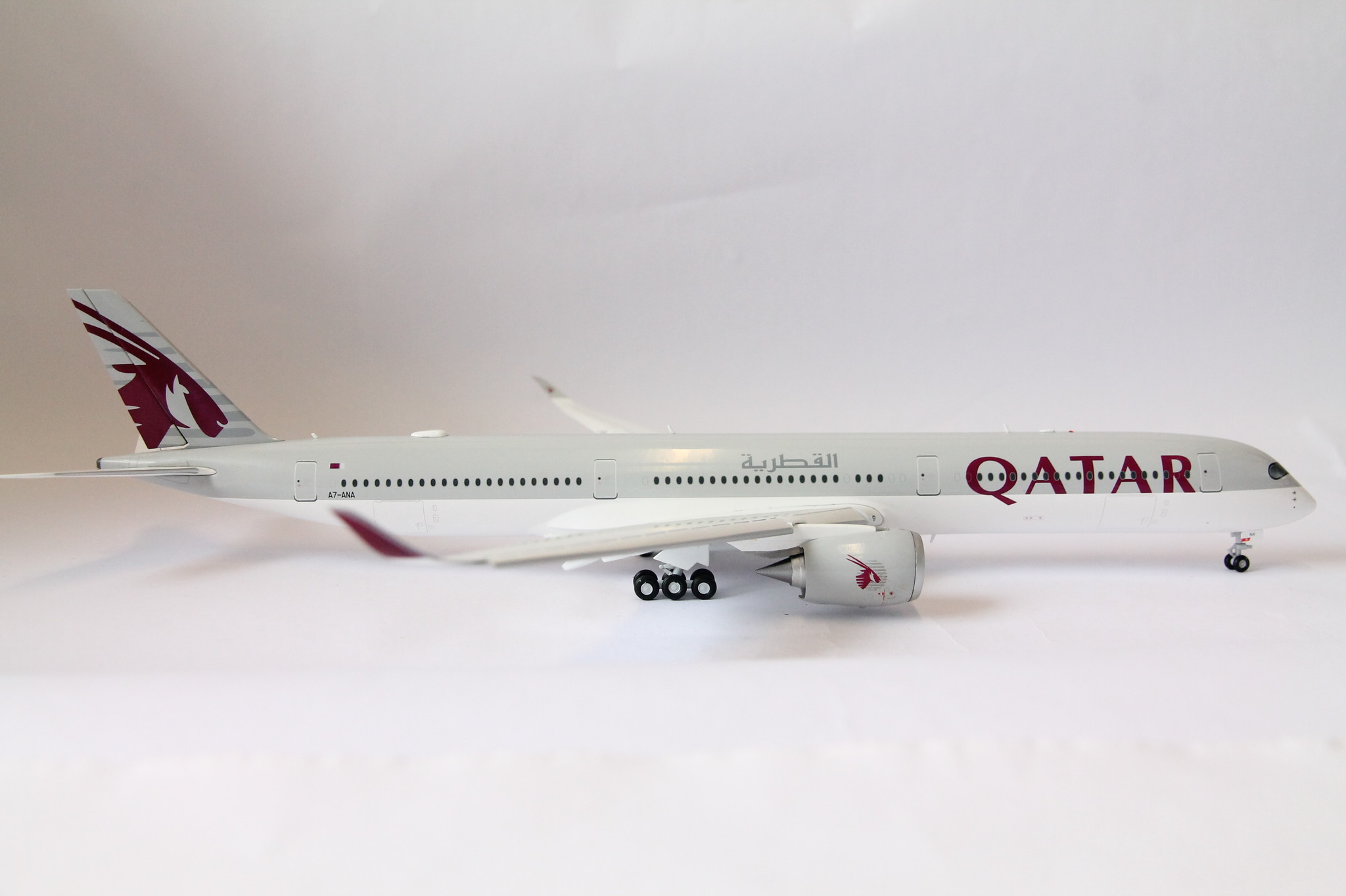 Airbus A350-1000 Qatar Airways with registration A7-ANA. Model can be displayed gear-up and down. Contains antennas, steerable nose gear, rolling gears, rubber tyres and "jeweled" beacons.